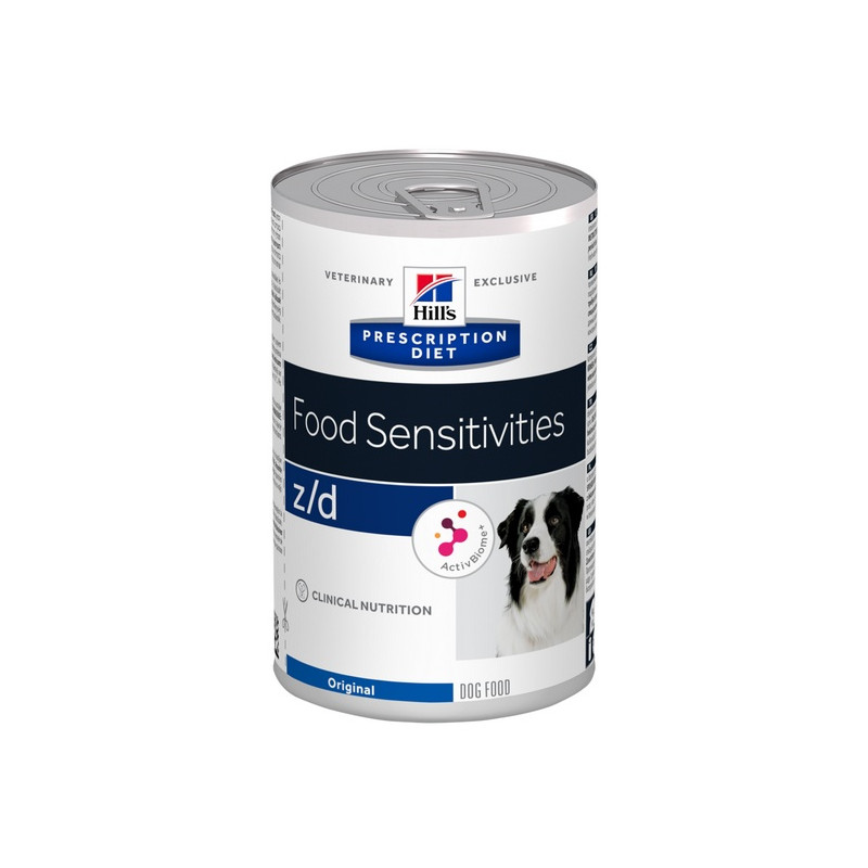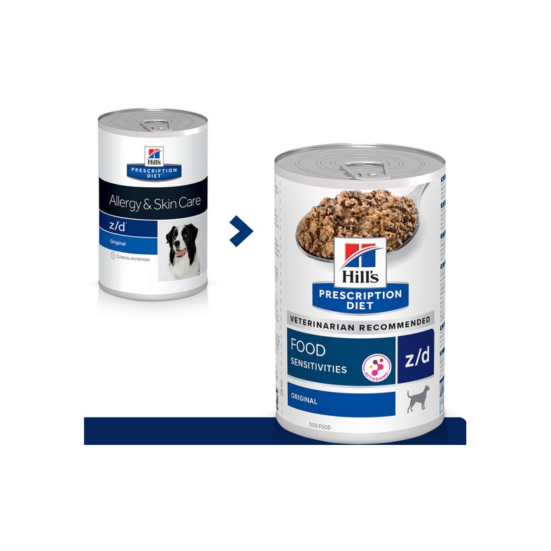 Hill's Prescription Diet z/d Canine puszka 370g to specjalistyczny produkt dla psów, który doskonale sprawdza się w przypadku zwierząt cierpiących na alergie pokarmowe. Jest to specjalnie wyselekcjonowana, starannie skomponowana dieta, która ma za zadanie wspomagać system immunologiczny czworonoga i zarazem ułatwić mu trawienie.