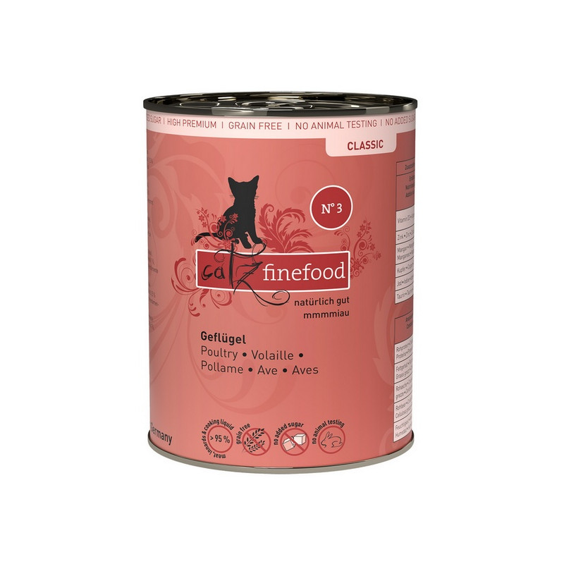 Catz Finefood Classic N.03 Drób puszka 400g to elitarna, pełnowartościowa karma dla kotów, która dostarcza odpowiedniej dawki białka, tłuszczów, witamin i minerałów niezbędnych do prawidłowego funkcjonowania organizmu Twojego pupila. Produkt jest stworzony z myślą o najbardziej wymagających kotach, pragnących smacznej, ale równocześnie zdrowej diety.